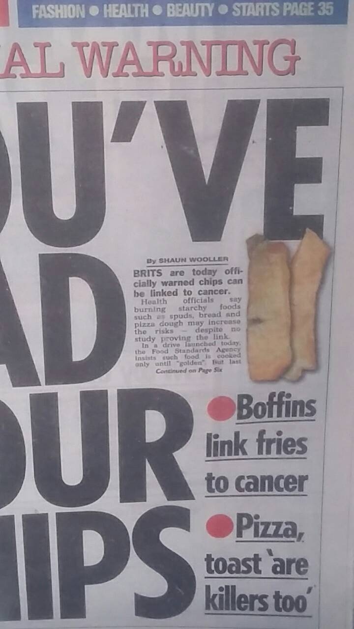 ROAST POTATOES – http://www.anorak.co.uk/436735/tabloids/scare-stories-roast-potatoes-give-you-cancer.html/